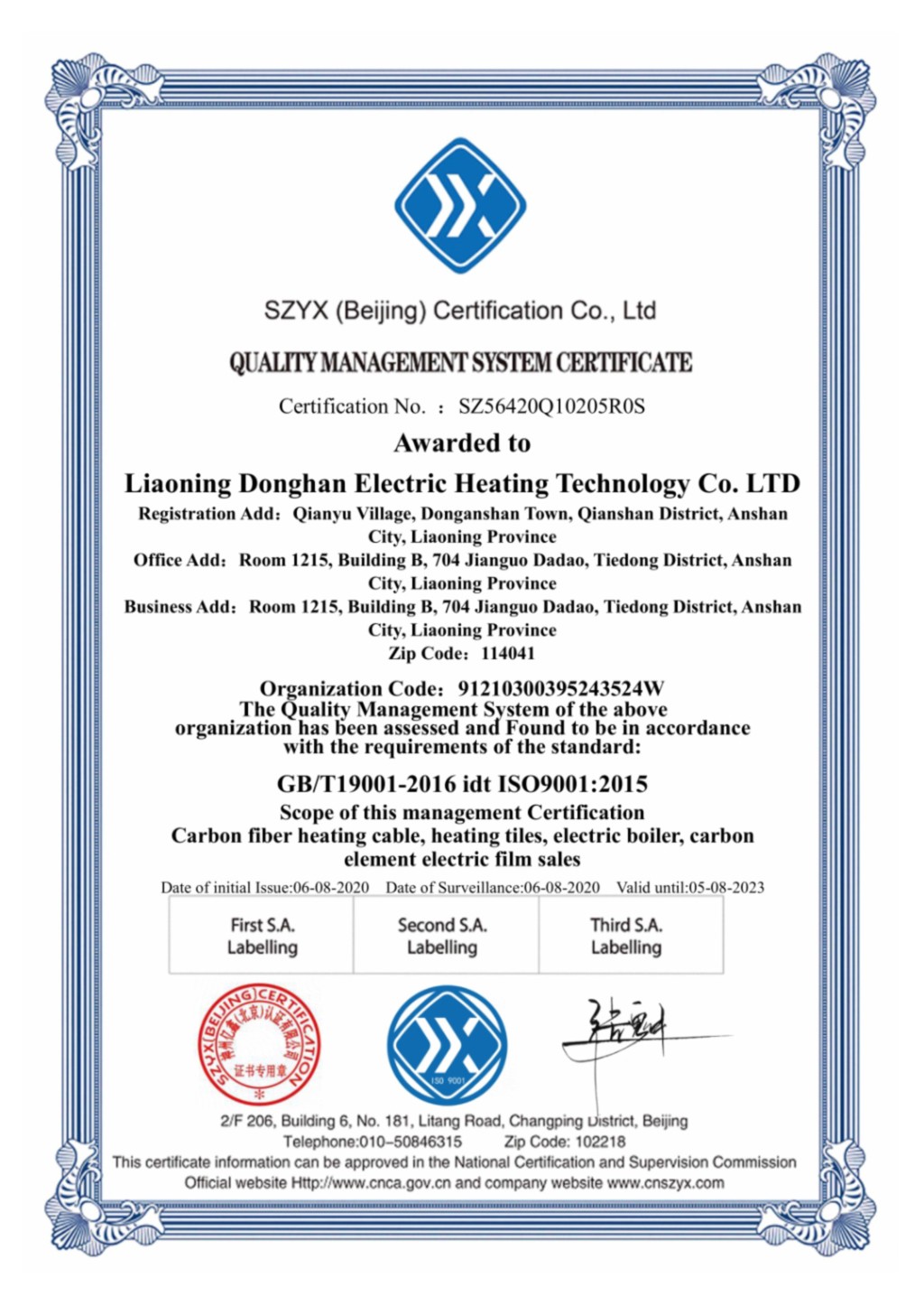質(zhì)量管理體系認(rèn)證證書(shū)英文